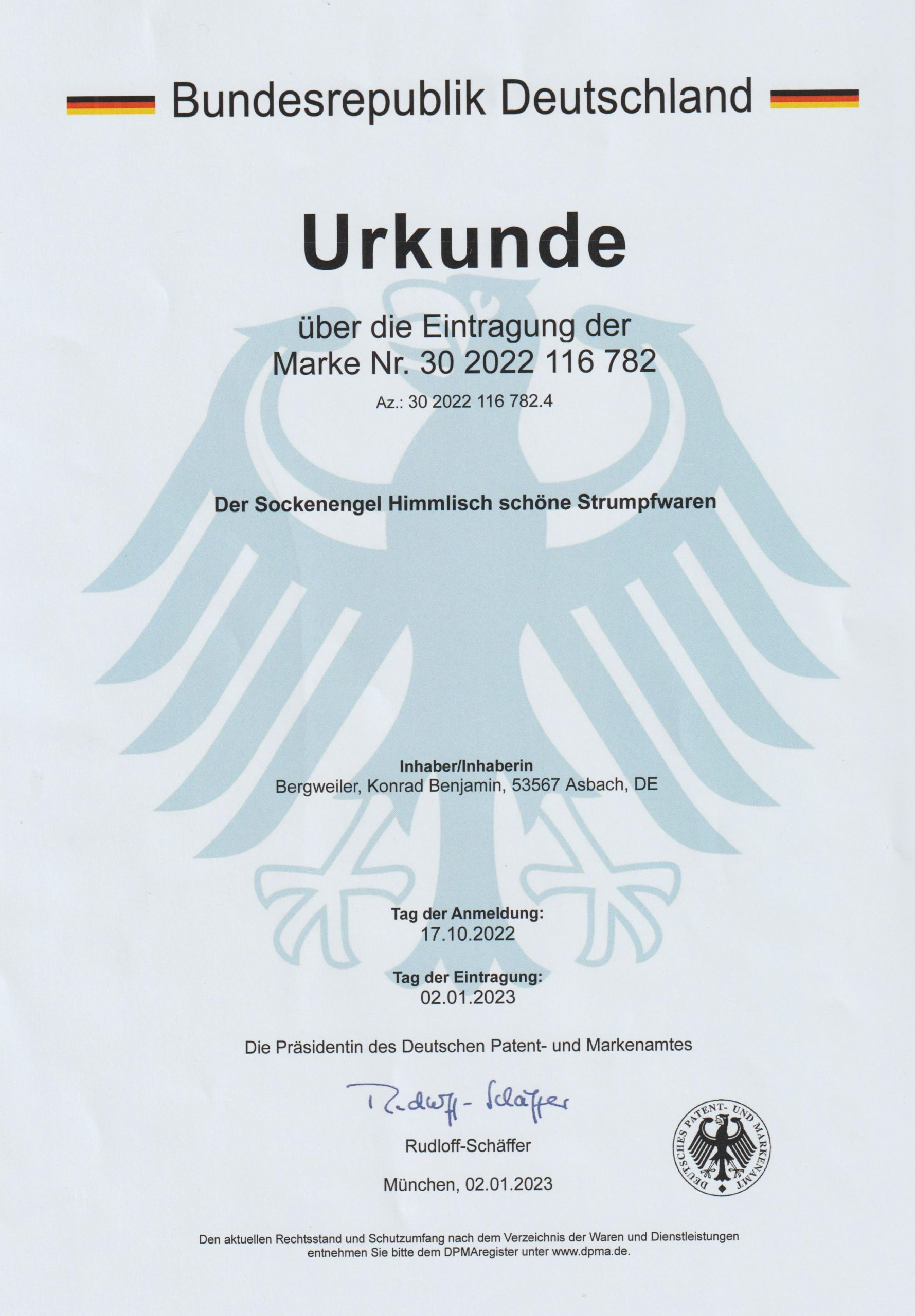 Der Socken-Engel ist aufgrund Ihrer Qualität beim Deutschen-Patent-und Markenamt in München eingetragen.
